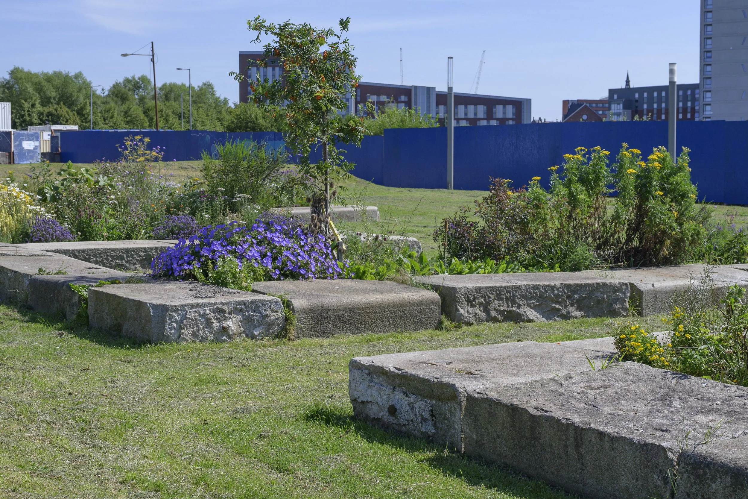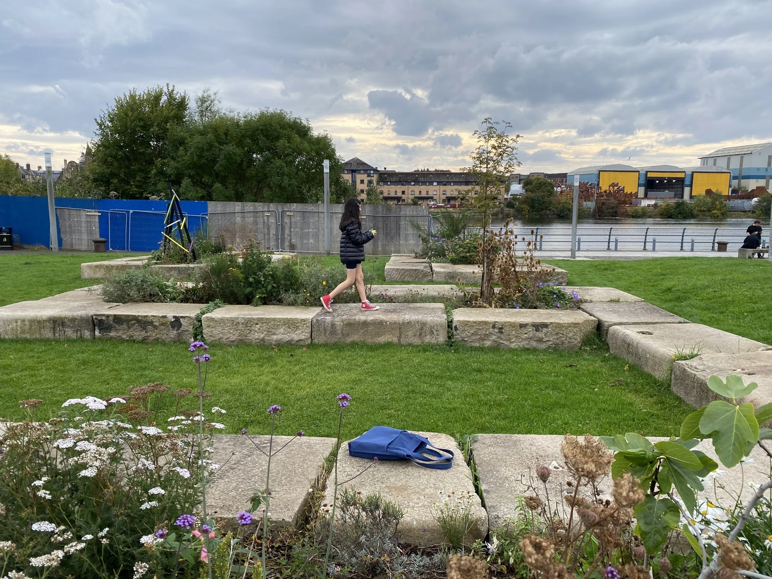 The stones that form the infrastructure of the garden space are the original quay stones from the Anchor Line harbour and Meadowside Shipyard that once operated from this site on the River Clyde.