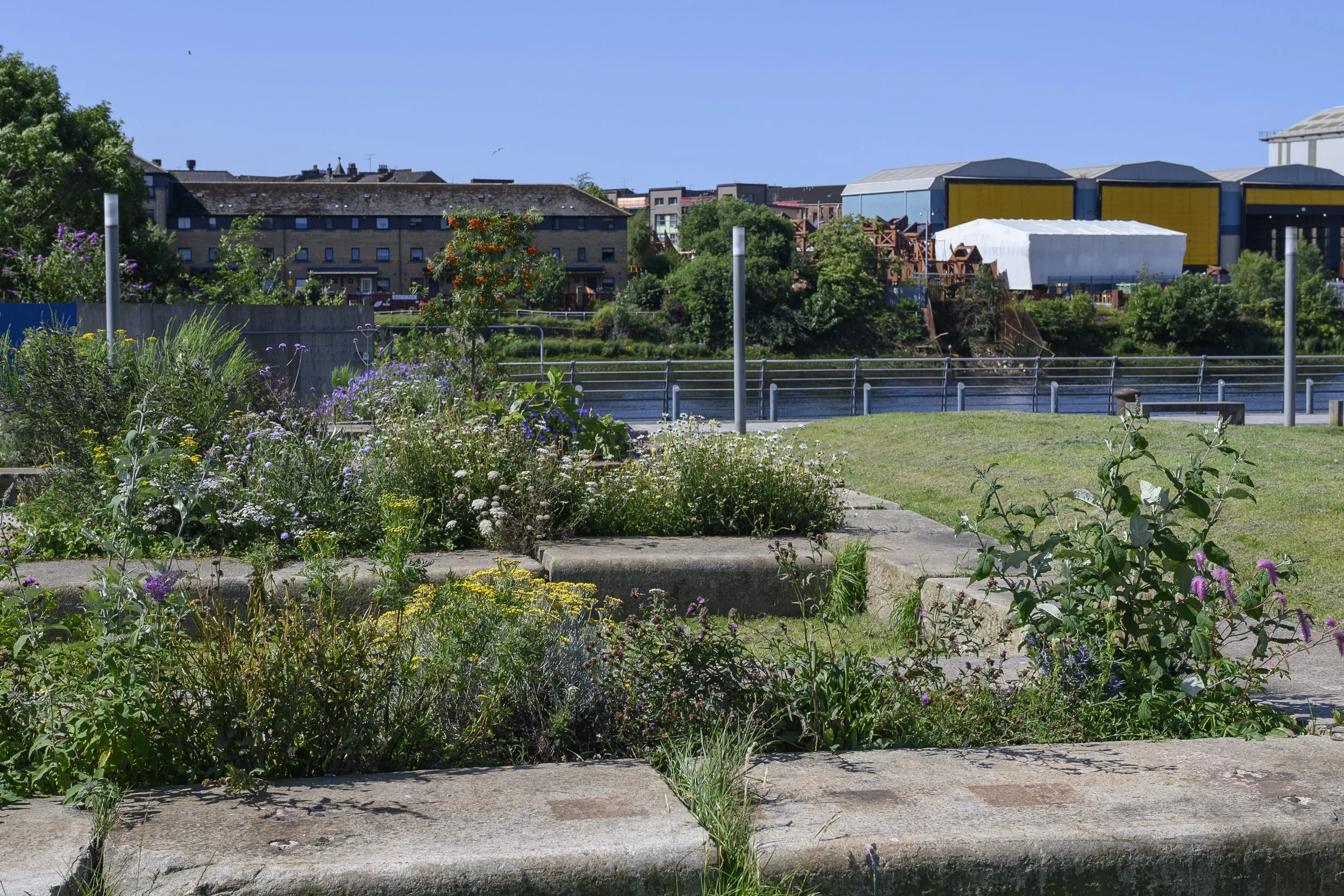 Clydeside Garden is a brownfield-inspired open-access public garden created on ‘meanwhile’ land at Glasgow Harbour.